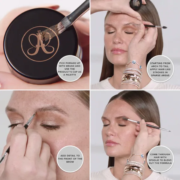 - For professional-quality results, apply Anastasia Beverly Hills DIPBROW® Pomade with Brush 12, a synthetic makeup brush ideal for applying cream formulas and creating natural-looking hairlike texture and outlining and detailing the brow. Get a precise application by first working the product from side to side on the outside of the cap using the brush; this ensures you don't load too much product and keeps the brush thin.