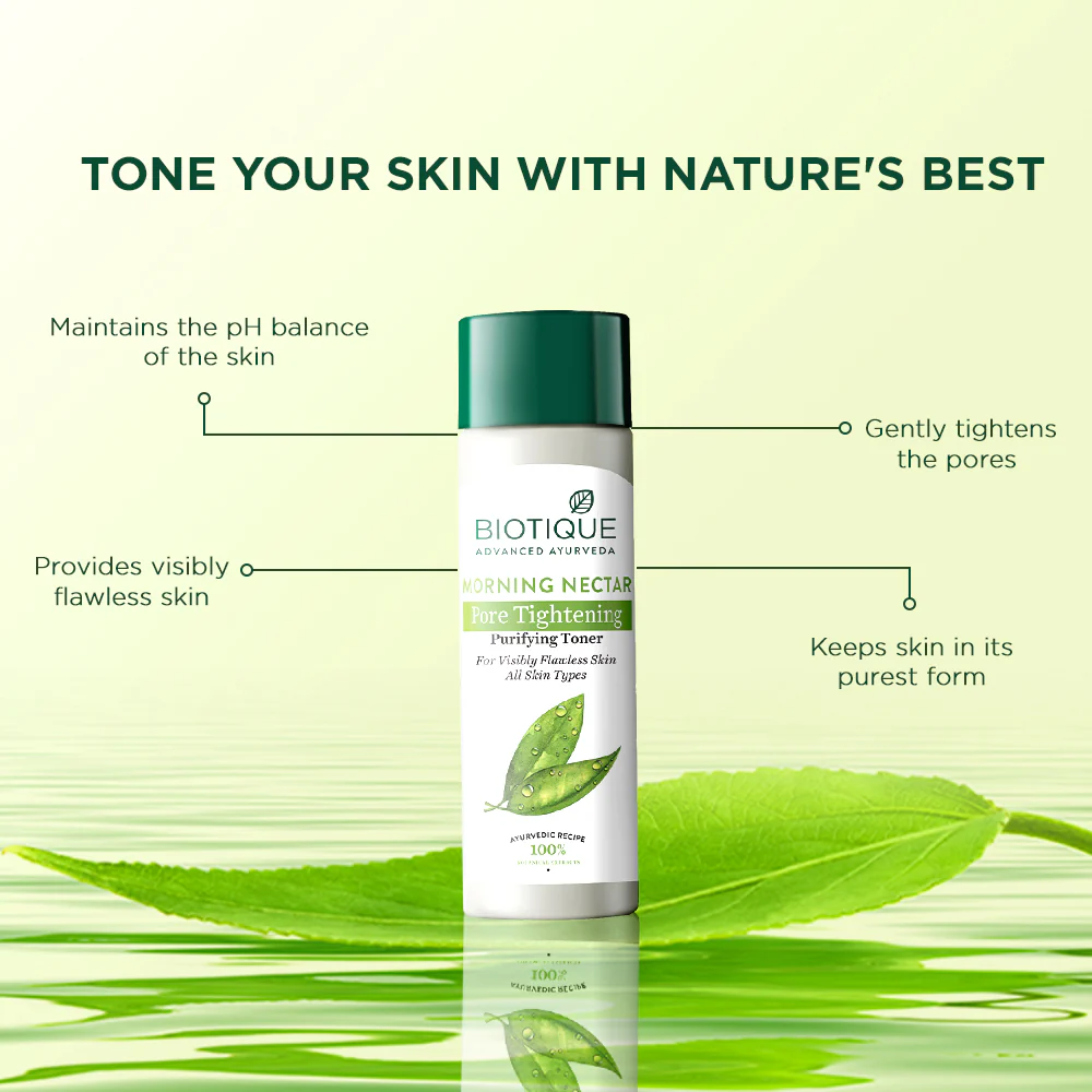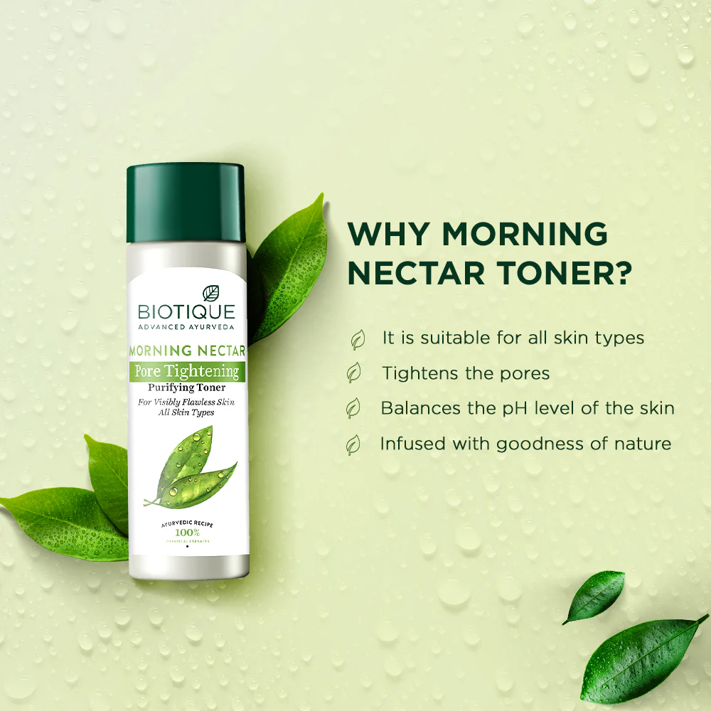 MORNING NECTAR Purifying Toner is nature's greatest cooling, purifying, refreshing, pore tightening and purifying toner is blended with carrot seed, aloe vera, nutgalls, rose petals, manjistha, hibiscus flower, honey and the fresh waters found in the foothills of the himalayan water. It is formulated to bring the complexion into perfect pH balance and help keep skin in its purest state.