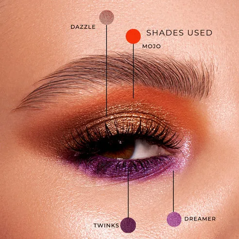 Apply the lightest shade over the entire eyelid to create a base. Blend any medium shade from the outer corner to the centre of the eyelid and into the crease. Pick a deep shade and apply along the top and bottom lash lines. Blend the same into the outer corner and crease. Bring in the drama by topping the lid with any shimmer/metallic shade to finish the look.