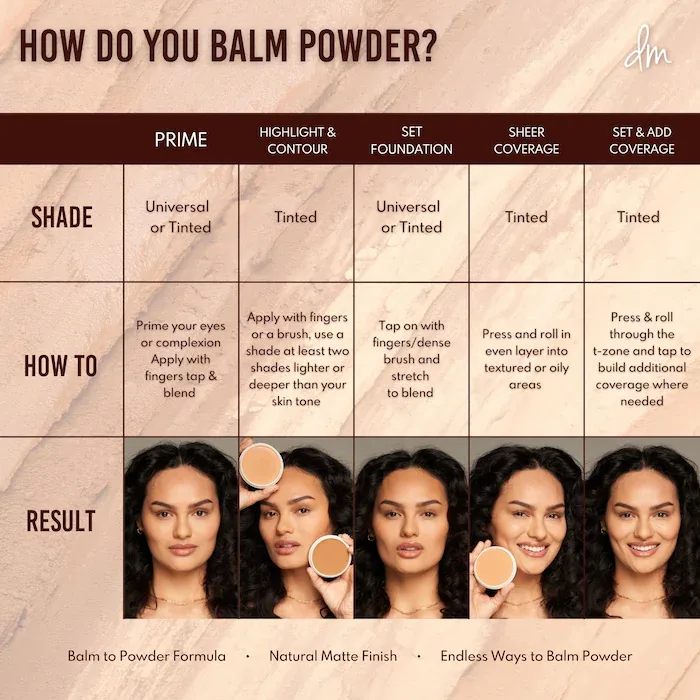 -To add sheer coverage: using a tinted shade, press and roll in an even layer into textured or oily areas.