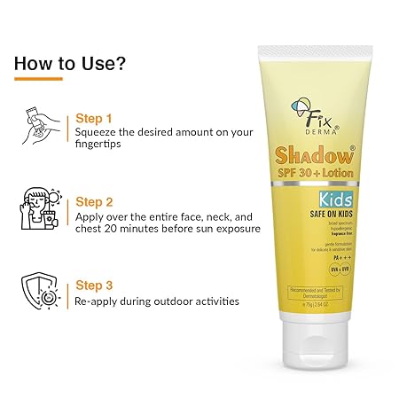 DIRECTIONS FOR USE: Fixderma Shadow Kids Spf 30+ Lotion is applied 15 to 30 minutes before sun exposure, followed by one re-application 15-30 minutes after the sun exposure begins. Further re-application is only necessary after activities such as swimming or after excessive sweating.