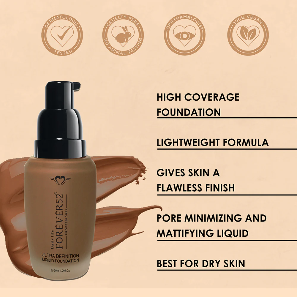 Take a few drops of the Ultra Definition Liquid Foundation on your fingertips and apply in dots all over your face and neck. Blend well with a beauty blender sponge or brush