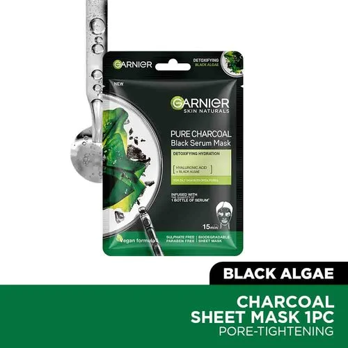 DETOXIFIES SKIN IN 15 MINUTES: The Garnier charcoal mask detoxifies the skin in just 15 minutesENRICHED WITH POWERFUL INGREDIENTS: This Garnier sheet mask is formulated with potent ingredients like Black Algae Extracts and Hyaluron to help you achieve maximum benefits with easeCONTAINS ONE BOTTLE OF SERUM: The Garnier charcoal sheet mask contains the power of one bottle worth of serumSUITABLE FOR ALL SKIN TYPES: This sheet mask is dermatologically tested and suitable for all skin typesPROVIDES INTENSE HYDRATION: It removes impurities, purifies the skin, and provides intense hydration without leaving your skin feeling extra oily