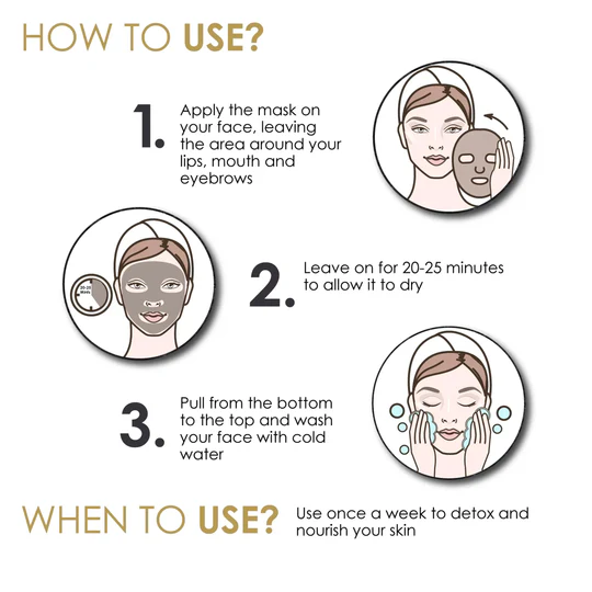 1. Cleanse your face and neck thoroughly.2. Evenly spread the mask along your face and neck3. Wait for 15-20 minutes or until the mask completely dries.4. Gently peel off the mask from the side of the face.