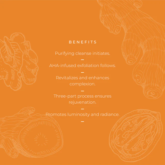 This face mask recipe restores the radiant complexion in three steps. It starts with cleansing, followed by AHA-based exfoliation that gives a boost to your complexion. The encapsulated Ginger Balls and Aloe Vera based gel removes patches and dark spots. The third step is a facial massage with correction complex cream that provides complete relaxation.