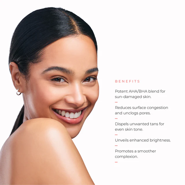 If you and sun are not friends, then this product is for you. A potent De-Tan system. It has high strength Alpha hydroxy acid (AHAs) and Beta hydroxy acid (BHAs) to ideally treat sun damaged skin. It diminishes skin's surface congestion and removes the tan to reveal a brighter and clearer complexion.