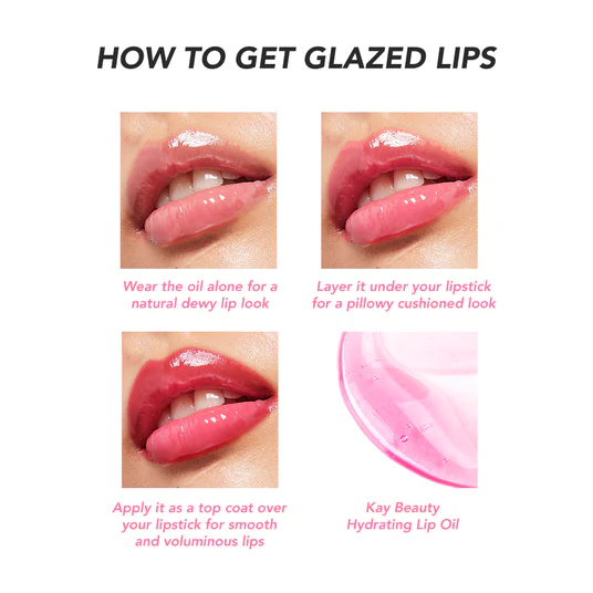 Look 1 - Wear the oil alone for a natural dewy lip lookLook 2 - Layer it under your lipstick for a pillowy cushioned lookLook 3 - Apply it as a top coat over your lipstick for smooth & voluminous lips