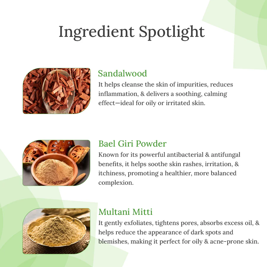 - Fights Acne & Breakouts: Sandalwood's antibacterial properties and Baelgiri's anti-bacterial actions help to prevent acne and blemishes.
