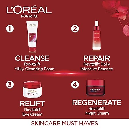 L'Oréal Paris Revitalift Moisturizing Day Cream and face moisturizer is enriched with anti-ageing elements that reduce fine lines & wrinkles, boost skin firmness, youthfulness, radiance and provides sunscreen / UV protection. . A powerful anti-ageing day cream created by L'Oréal Skincare Laboratories for triple action that gives transformed skin . Instantly boosts the skin texture on 8 key zones for a smoother, fairer and younger looking look .Dermalift Technology, Pro-Retinol A & Centella Asiatica to re-firm, restore & and replump the skin .Use daily with Revitalift Essence, Night Cream & Eye Cream for a complete anti-ageing solution. Dermatologically tested. Suited for oily, dry & all skin types.