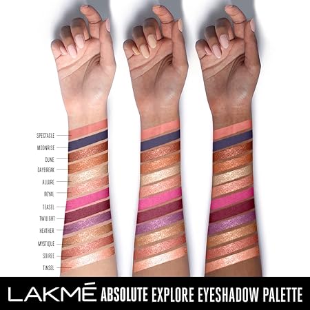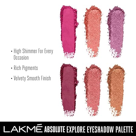 Whether your vibe is bold or dramatic, The Lakmé Absolute Explore Eyeshadow palette is the addition your make-up bag needs at the moment! Introducing - The Lakmé Absolute Explore Eyeshadow palette, for fans of shimmer shades that can be mixed and matched in any number of ways! With an excellent color pay-off and an easy-to-blend formula, this eye shadow palette gives you a velvety smooth finish that you've been craving for. Each shade of this palette is buttery and touts a unique high shimmer particle system that ensures that the color on your eyes is vibrant, smooth and long-lasting. Can't get enough of the shimmer? Well, lucky for you this palette consists of 2 gorgeous sets: Desert Sunset and Purple Haze, each of which has its unique set of 6 shades. Ready to explore your shimmer look ladies? Get started by building a base with the light matte shadows. Then, create dimension with a darker shade along the bridge and outer corner of your eyes. Now, pick one of the shimmer shades for a pop of shine towards the center or inner corner. So, what's the wait for girls? Get ready to sparkle for every occasion and live your Shimmery-Diva-Dreams!