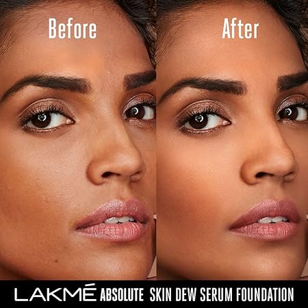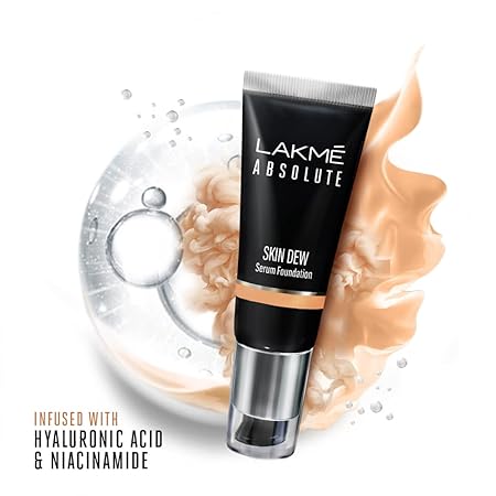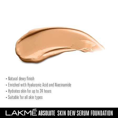 To all our skincare lovers, this one is for you! Introducing Lakme Absolute Skin Dew Serum Foundation. Get the best of both worlds of makeup & skincare with Lakme's newest foundation that is infused with a serum, that suits all skin types! Lakme's best foundation which is infused with the goodness of Hyaluronic Acid and the power of Niacinamide, it makes your skin feel nourished and hydrated on the inside while making it look flawless and radiant on the outside. This serum-in-a-foundation gives a dewy, medium-high coverage finish that lasts up to 24 hours and is curated to cover and care in 12 different shades to 100% of Indian skin tones! Consider it a "magic portion" in a bottle! Massage the tube and pump a dollop of the Lakme Absolute Skin Dew Serum Foundation on your palm and dot it all over your face. Dab it on your cheeks, forehead, neck and all the areas that require coverage, as per your need. Finally, blend onto your skin in soft circular motions. The result? A smooth radiant-looking finish. What are you waiting for ladies? Get ready to glam up, while taking utmost care of your skin with Lakme Absolute Skin Dew Serum Foundation.