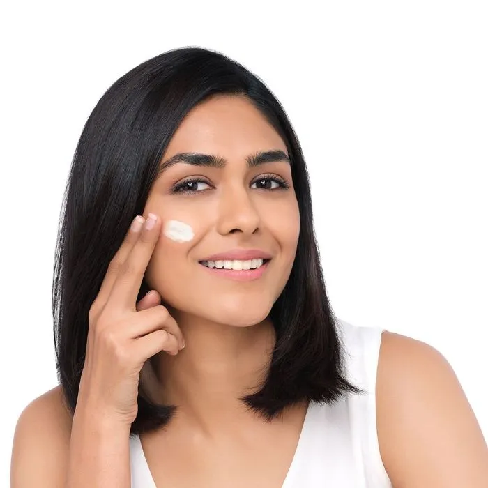 Take out a tiny amount on your palm. Dot your face with moisturiser. Gently massage it into the skin using finger-tips, with upward-outward strokes.