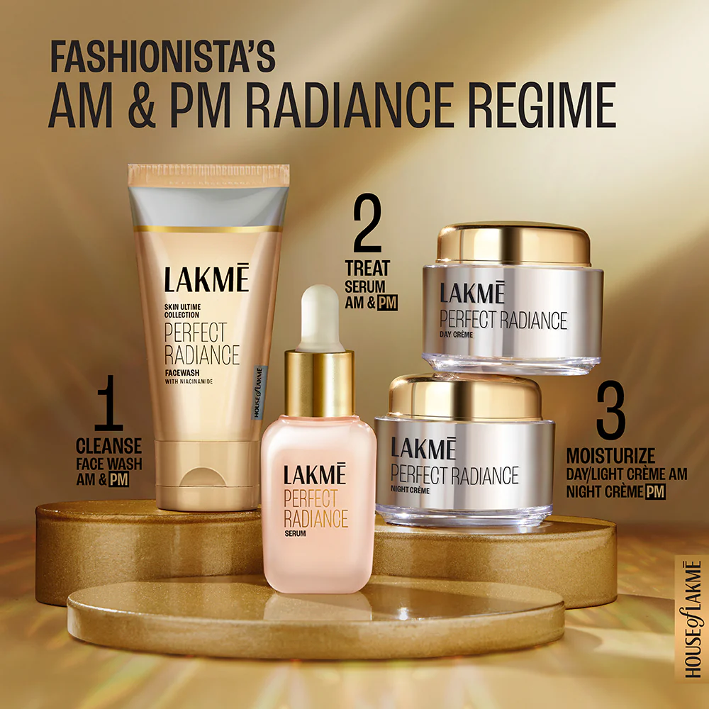 - Dot the forehead, cheeks, nose, and chin. - Using fingers, gently massage the cream in an upward and outward direction in a spiral motion. If you wish for skin that has a flawless and illuminating glow, then this Lakme Absolute Perfect Radiance Skin Lightening Day Crème is formulated just for you.