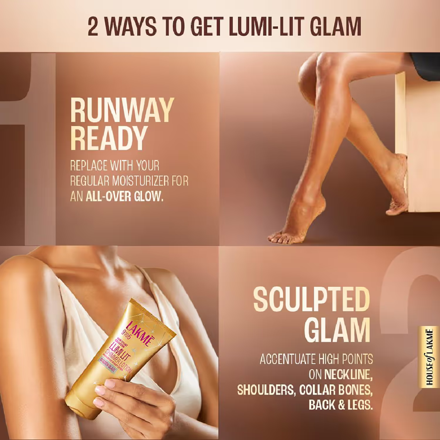 - Apply the Lakme Lumi Lit Lotion onto clean, dry skin and blend evenly for an instant luminous glow.