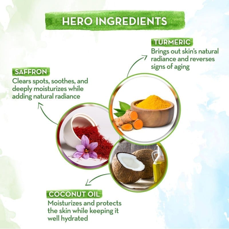 - Brightens skin: Turmeric and saffron are known for their brightening effects on the skin.