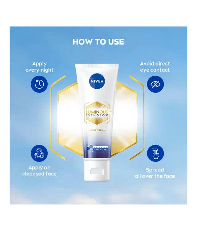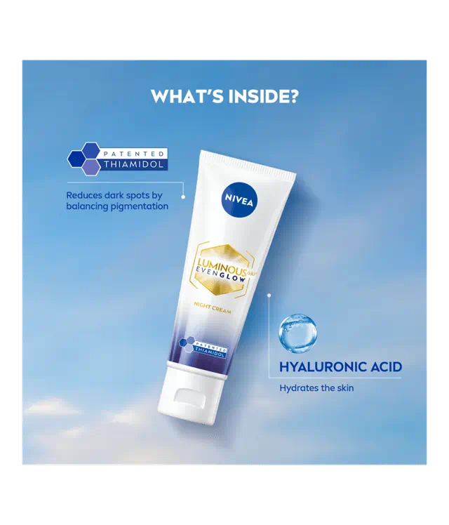 Wake up to an even, luminous complexion with our new Luminous Even Glow Night Cream. This night cream features Thiamidol, a powerful anti-spot ingredient that targets dark spots from day one, visibly reducing and lightening them. Enriched with hyaluronic acid for intense hydration, it moisturizes and plumps your skin while you sleep, reducing dullness and even out your skin tone to reveal skin's natural luminosity.