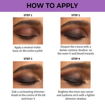 - Deepen the crease with a darker contour shadow on the outer V and blend inwards