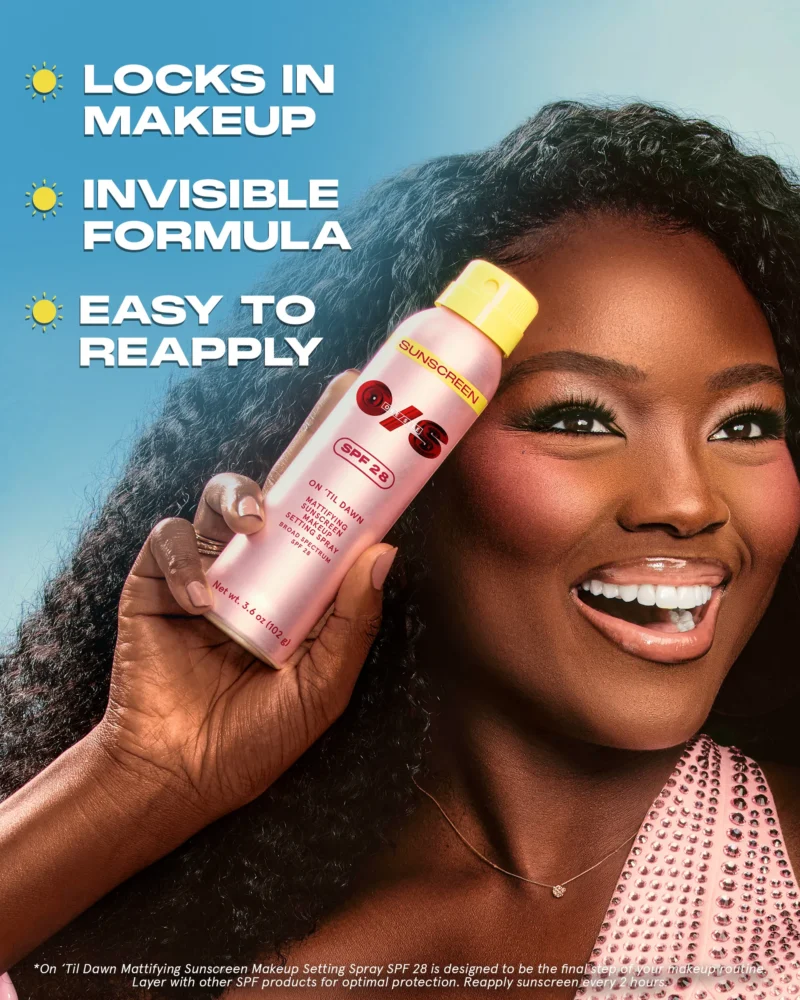 A makeup-setting spray with SPF 28 that locks in makeup for up to 16 hours without disrupting your glam. This ultra-fine aerosol mist delivers 80 minutes of sweat-resistant, broad spectrum protection with no white cast or sticky feel.