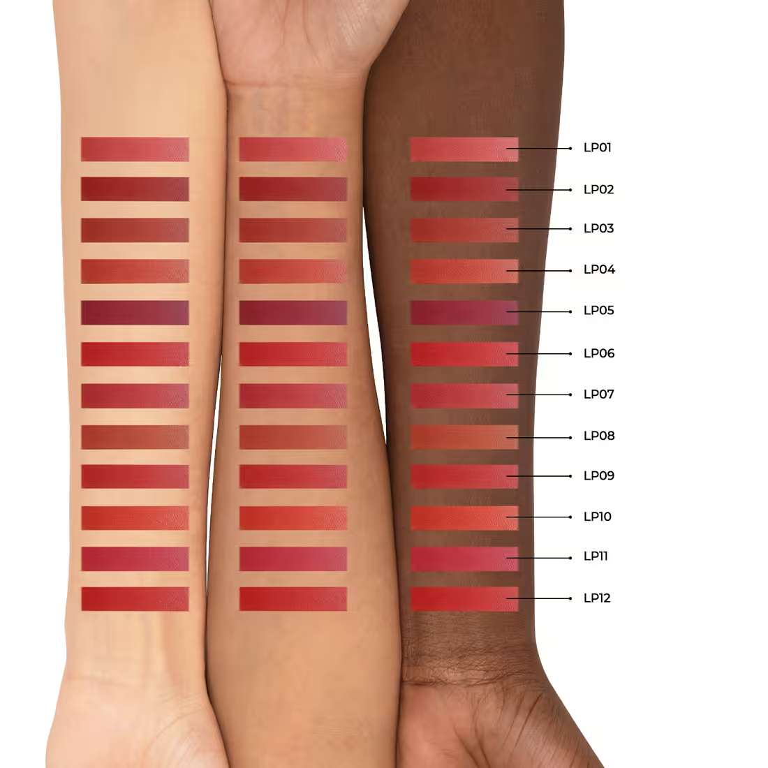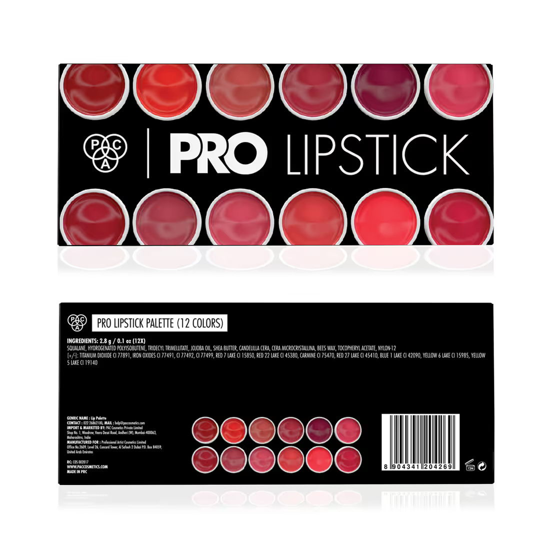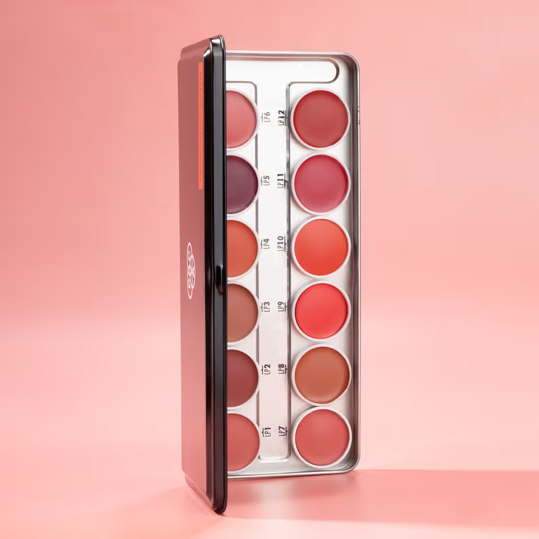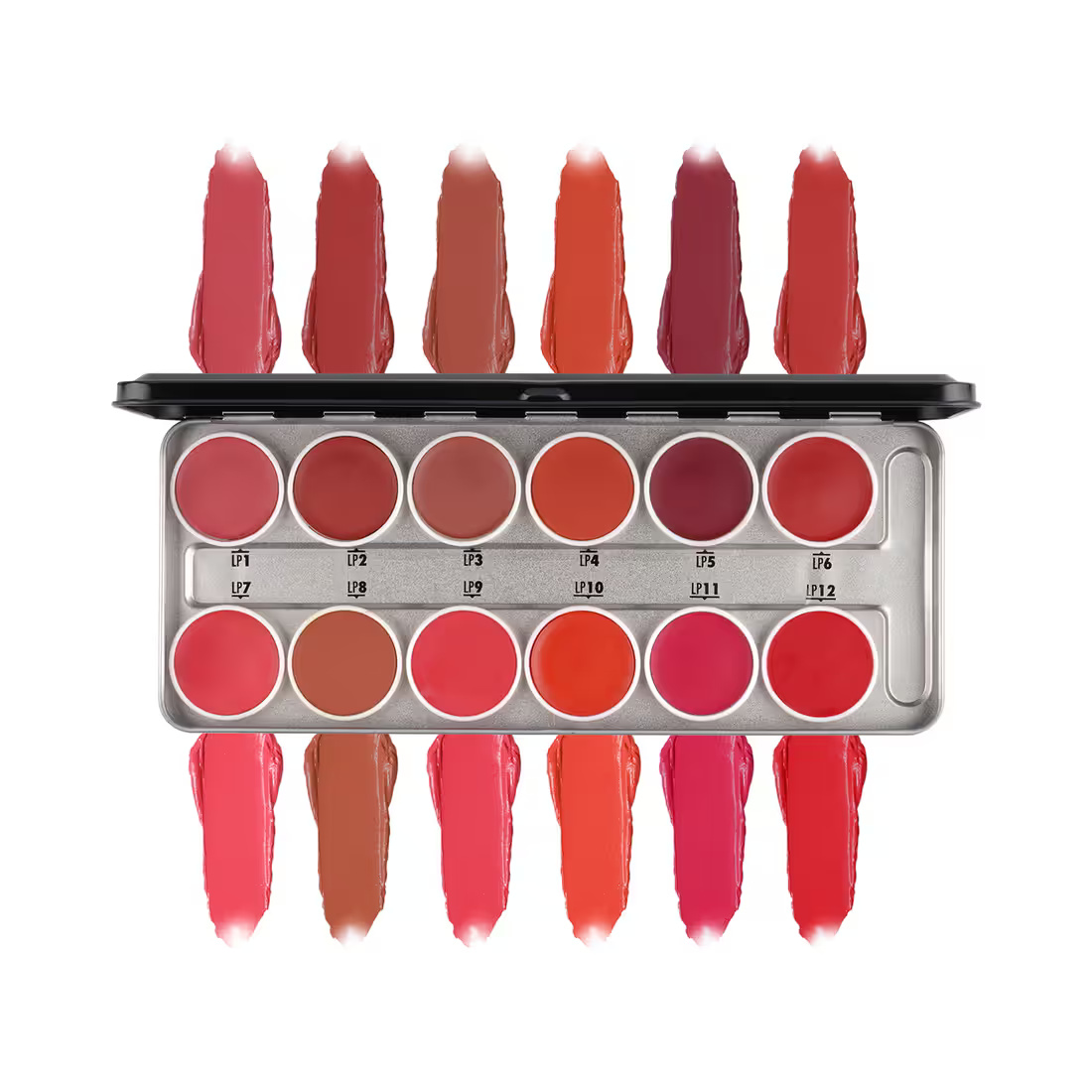 Start by using a PAC angular makeup brush to outline and fill the outer corners of your lips with your chosen lip shade from the lipstick palette. Scoop the pigment from the palette onto a metal plate using a spatula, then gently apply the color with a PAC lip brush for a smooth matte finish. Feel free to mix two or more shades on the metal plate to create a custom shade that perfectly suits your look.