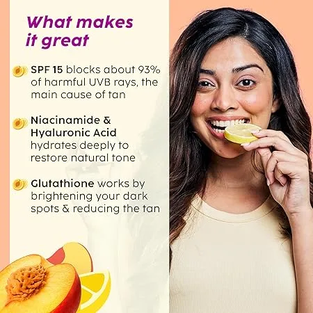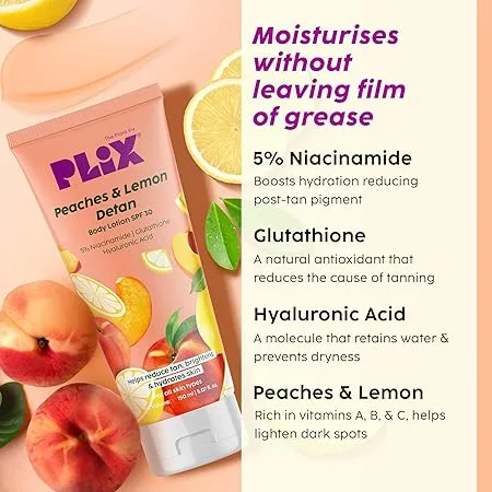 How to use For best results, start by cleansing your body with Plix Pineapple De-Pigmentation Body Wash to remove impurities. Next, take a generous amount of Peaches & Lemon Detan Body Lotion and massage it gently in circular motions, focusing on areas like elbows, knees, and other exposed parts.