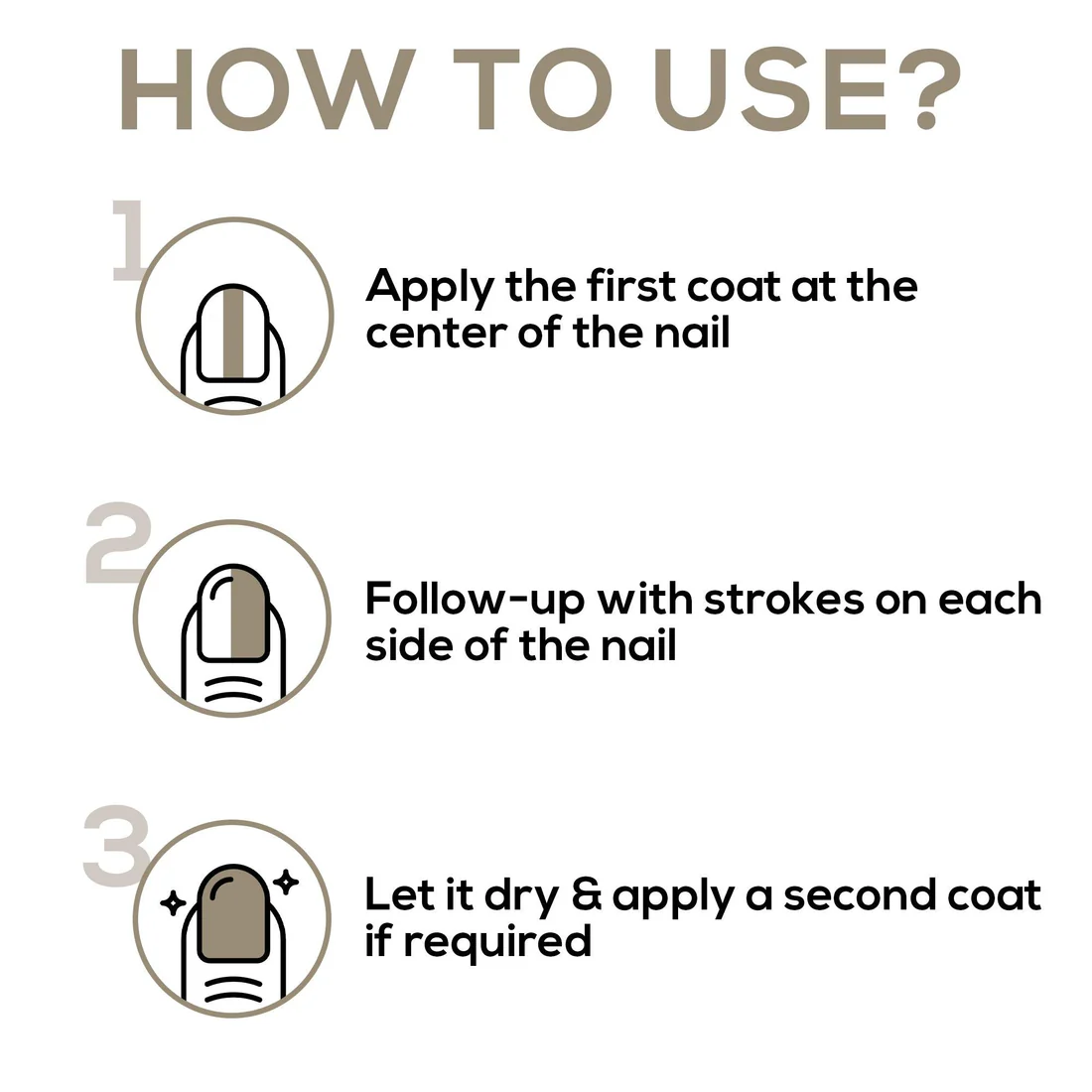 Apply the first coat at the center of the nail, follow-up with strokes on each side of the nail. Let it dry & apply a second coat if required
