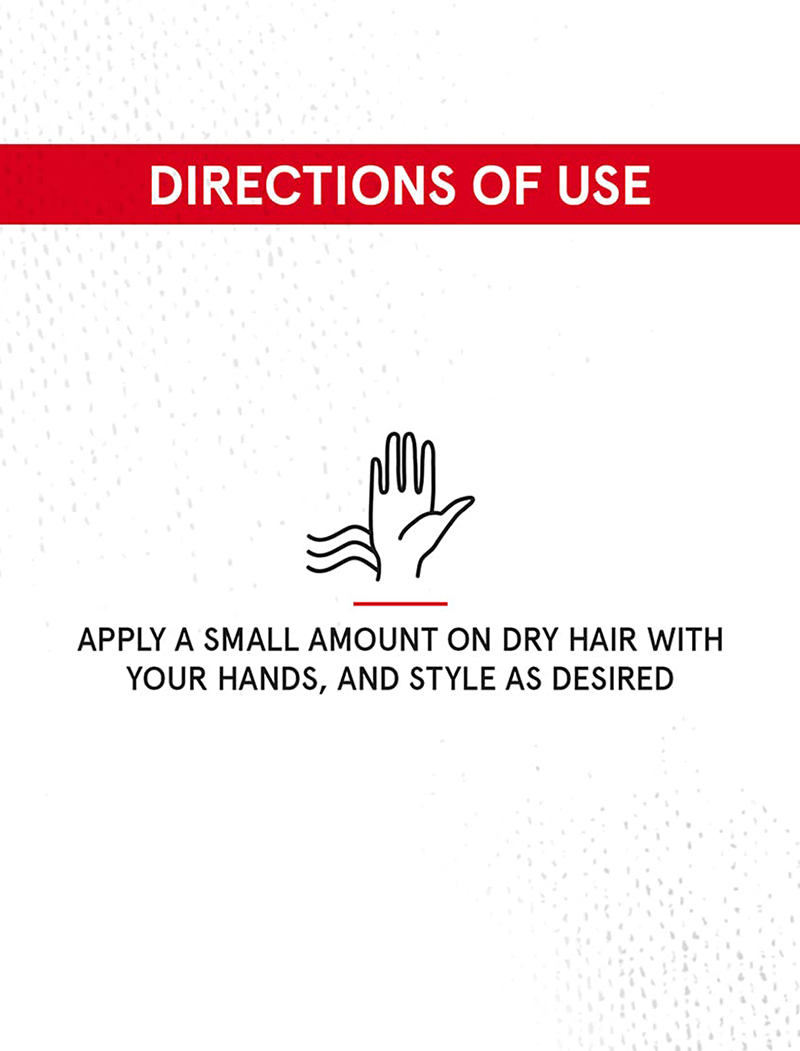 Apply a small amount from hands into dry hair, style and texture as you wish. Can also apply a very small amount on wet hair before blow-drying, for a glossy frizz control finish on thick hair.
