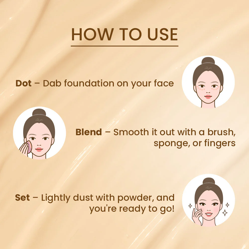 - Apply to face: Dot the foundation onto your cheeks, nose, forehead, and chin.